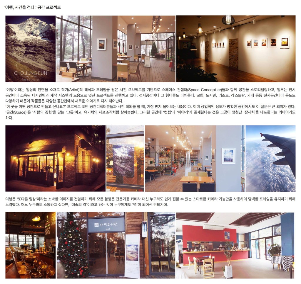 ‘여행’이라는 일상의 단면을 소재로 작가적 해석과 프레임을 담은 사진 오브젝트를기반으로 스페이스 컨셉터(Space Concepter)들과 함께 공간을 스토리텔링하고, 일부는 전시 공간마다 소속된 디자인팀과 제작 시스템의 도움으로 멋진 프로젝트를 진행하고 있다. 전시공간마다 그 형태들도 다채롭다. 교회, 도서관, 리조트, 레스토랑, 카페 등등 전시공간마다 용도도 다양하기 때문에 작품들은 다양한 공간 안에서 새로운 이야기로 다시 태어난다.
