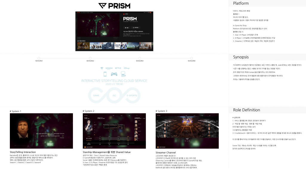 게임시스템은 프레임만 제공하고, 그 안의 세계를 플레이어 스스로가 채워나가는 ‘플레이어 주도형 인터렉티브 컨텐츠’에 대한 실험연구이다. 이 실험은 넷플릿스 플랫폼 전체에서 서비스되고 있는 영화, 드라마가 게임 컨텐츠의 소재가 된다는 가설에서 부터 시작한다. 플레이어들은 자신이 구성하고 싶은 스토리라인과 캐릭터 설정을 기성의 영화 드라마의 커테고리에서 추출해서 스스로 게임의 세계관과 스토리라인을 커스터마이징할 수 있다. 그래서 프로젝트 이름도 ‘하나의 빛이 굴절매체를 통해 여러 개의 빛으로 다시 탄생한다’는 의미로’PRISM’이 된 배경이다. 플레이를 통한 경험으로 축적된 경험치는 ‘재화’로 환원되고, 그 재화를 통해 선수단을 만들고 운영하거나 인큐베이팅할 수도 있다. 실험연구에 도움을 주신 Netflix, Unity3D, Protopie 관계자분들께 깊은 감사의 말씀을 전합니다.